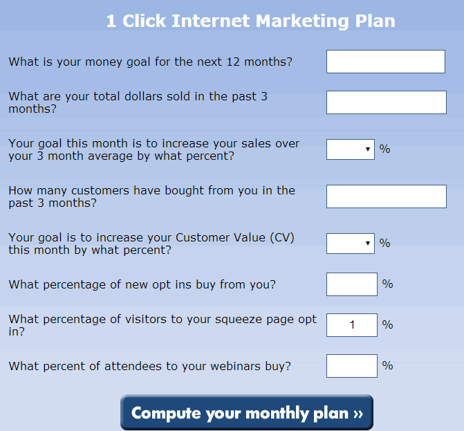 • Two: You get my 1 click marketing plan tool. Type in how much you wana make. Click the button. It spits out your A to Z plan. It's loaded with 12 hours of bonus training, and extra content.