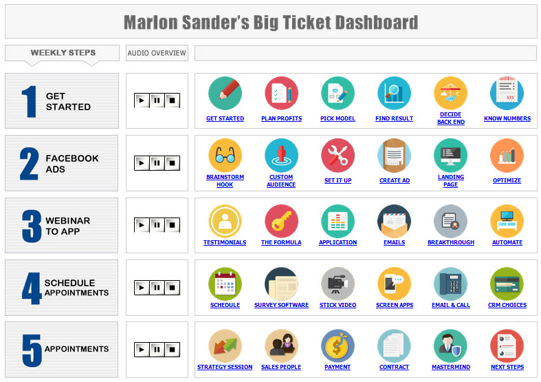 • One: The Big Ticket Dashboard with the point-and-click BIG TICKET sales training system that turns creating your big ticket sales system into a virtual no-brainer. The Dashboard is a step-by-step system that trains you how to make big ticket sales..